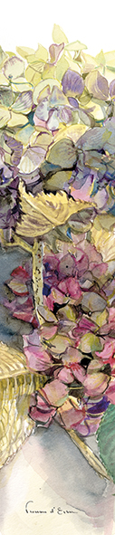 Reproduction d’aquarelle de Florence d’Ersu de différentes variétés d’hydrangea et de différentes vues de la pépinière ‘Les hortensias du Haut-bois’.(Format 21×4,5 cm, sur papier Rive, Tradition 250 grammes, blanc naturel).